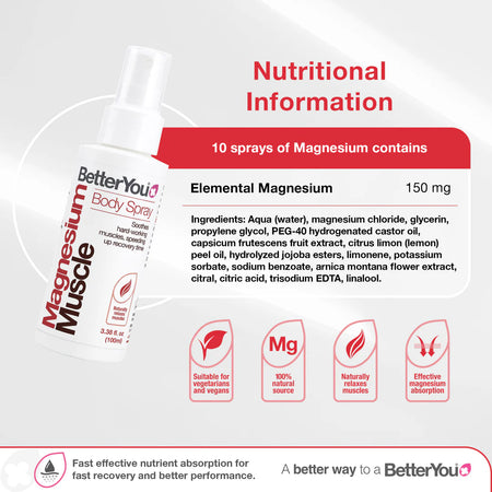 Magnesium Muscle Body Spray is an effective magnesium supplement formulated to soothe hard-working muscles. It contains a natural blend of magnesium chloride and energising lemon oil, arnica and capsicum to add a gentle heat to speed up recovery time.