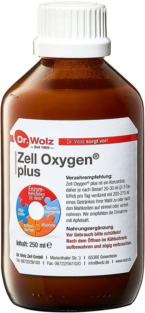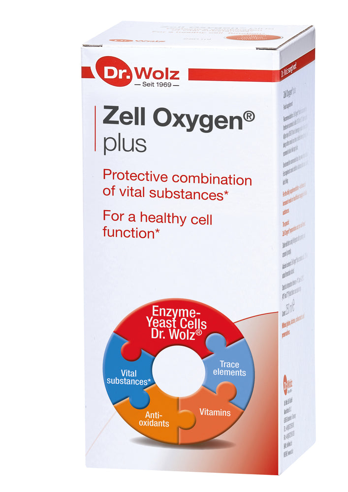 Dr Wolz Zell Oxygen Plus 250ml is an orthomolecular product with the special enzyme yeast cells from Dr. Wolz, biological protective enzymes as well as vitamins and trace elements (e.g. zinc, selenium). One glass every day provides your body with the perfect amount of valuable cell-supplying and cell-protecting substances.