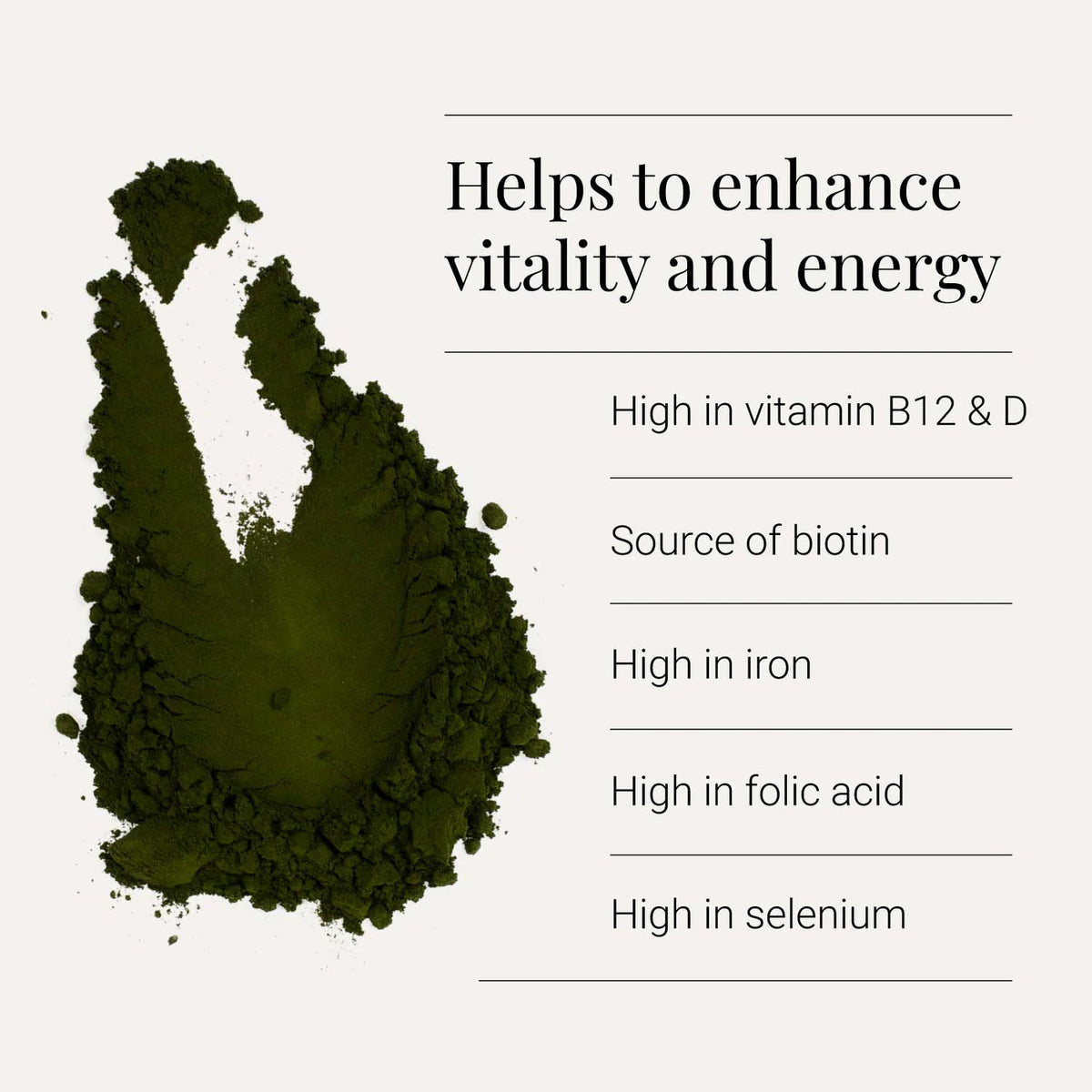100% Organic Broken Cell Wall Chlorella, contains no fillers, preservatives, sweeteners, or colours.