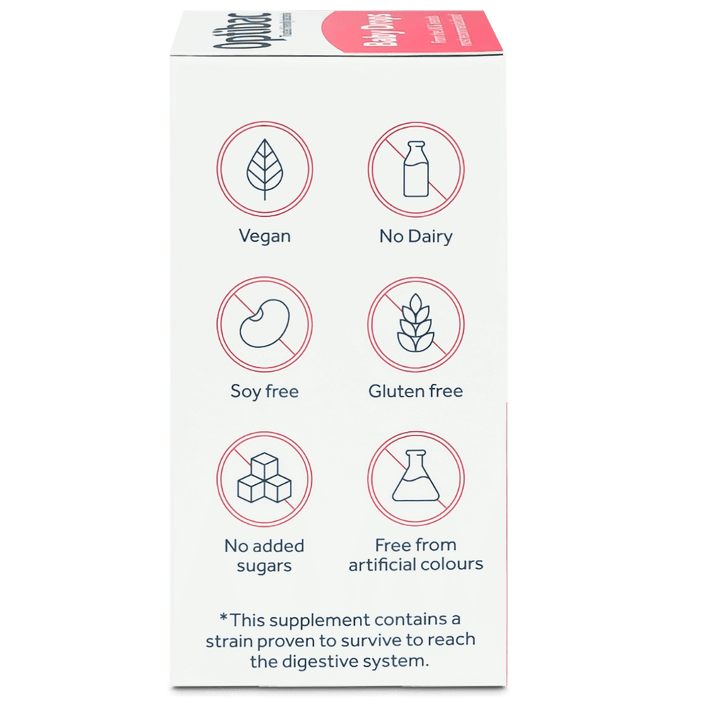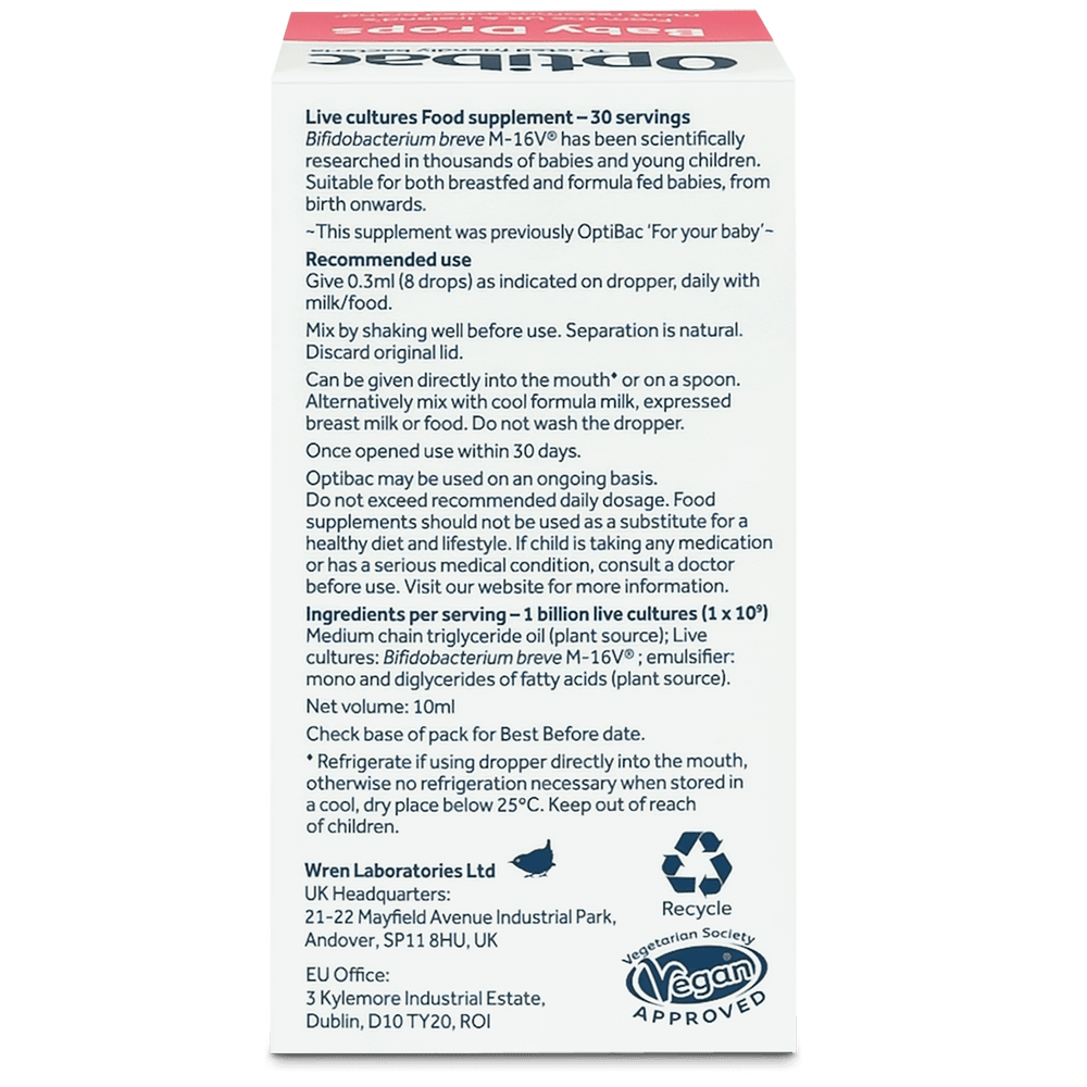 A high-quality, liquid drops supplement especially developed for use from birth to complement the baby's natural gut flora. Suitable for vegans, Baby Drops contains Bifidobacterium breve M-16V®, which has been scientifically researched in thousands of newborns and babies.