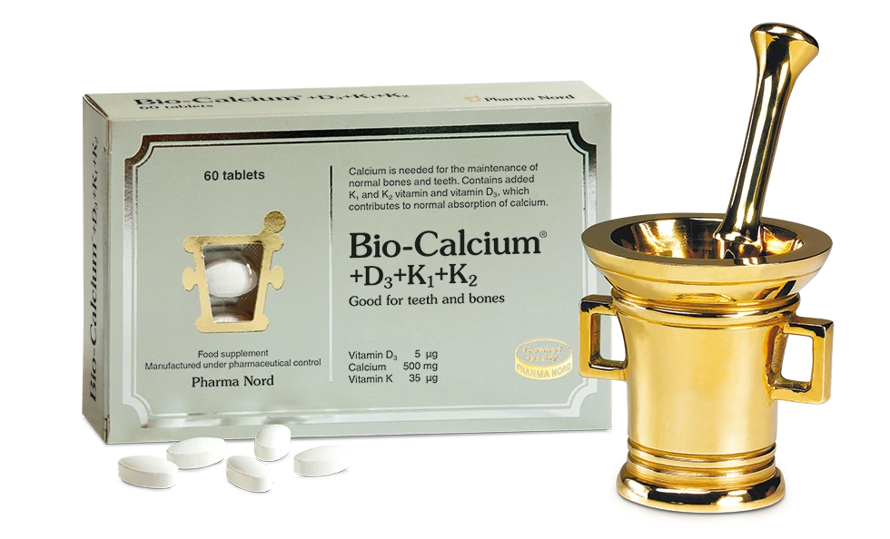 Calcium supplements from Pharma Nord contain calcium, vitamin D3, K1 and K2. Bio-Calcium + D3 + K1 + K2 uses a high percentage of elemental calcium in an easily absorbed form. Calcium and vitamin D contribute to the maintenance of normal bone in adults and the growth of bone in children. Older adults, in particular women around menopause, should have a daily intake of calcium to counteract the loss of bone mass which occurs in later life. Whilst young people need to build up strong bones at an early age.