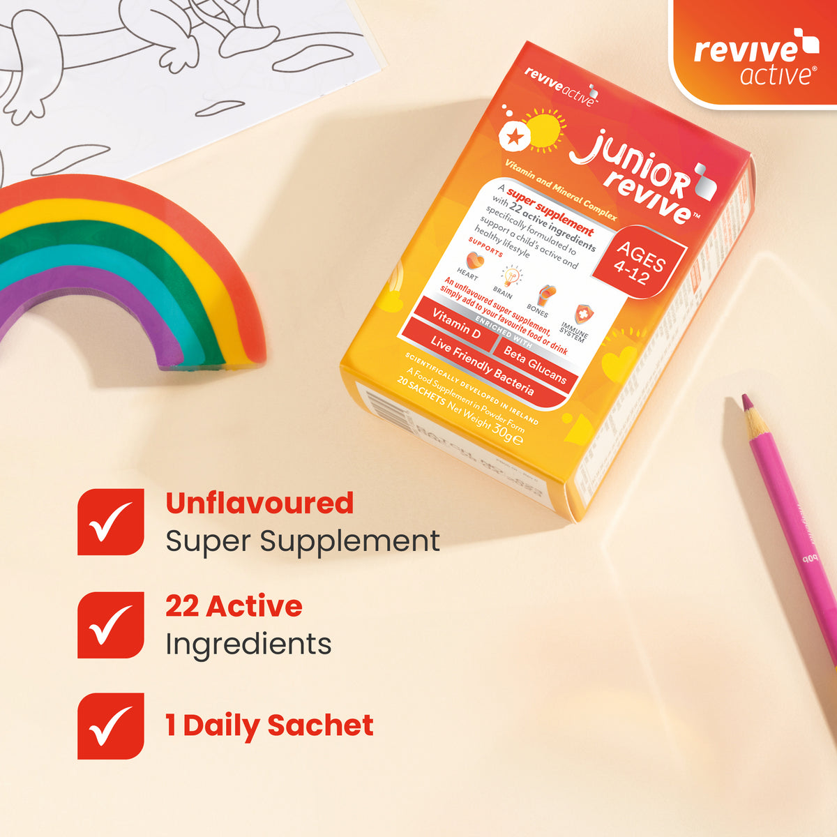 Junior Revive is unflavoured and offered in powdered formula to make it easy for kids to take in water, juice or even their favourite yogurt. It is free from fillers, binders, sugar, caffeine, preservatives, additives & colourants and suitable for vegans and vegetarians.