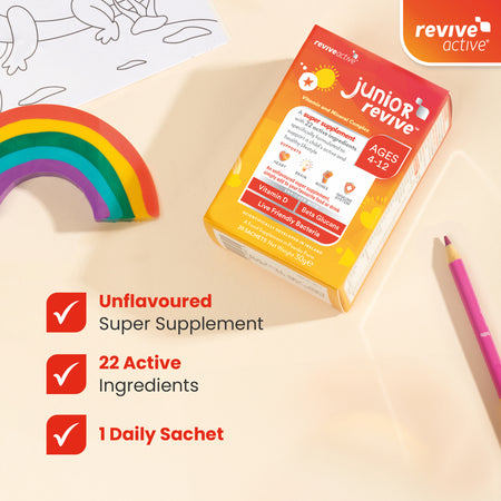 Just like adults, kids need a wide range of nutrients to help them be their best. Junior Revive contains a unique blend of prebiotics and probiotics, 4 fruit and vegetable powders, 18 vitamins & minerals and Wellmune®, a natural yeast beta 1,3/1,6 glucan, to provide optimum support for growing bodies.